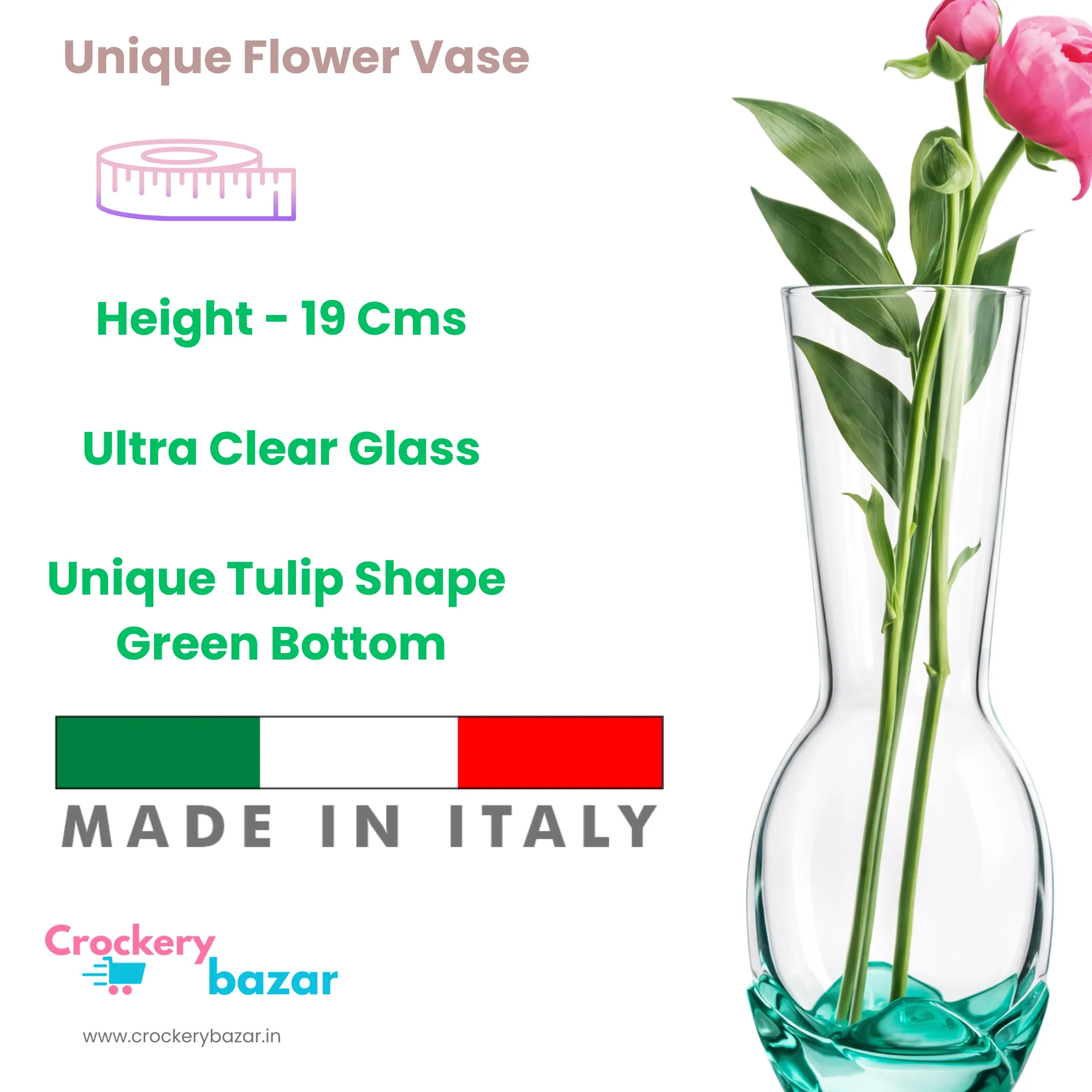 The crystal-clear glass body beautifully enhances fresh flowers, dried arrangements, artificial stems, or single statement blooms. Its subtle yet eye-catching green tulip-shaped designer base adds depth and character, creating a layered visual effect that instantly draws attention. The 19cm height makes it perfectly proportioned for compact spaces while still offering strong visual presence, making it suitable for both minimal and decorative arrangements.