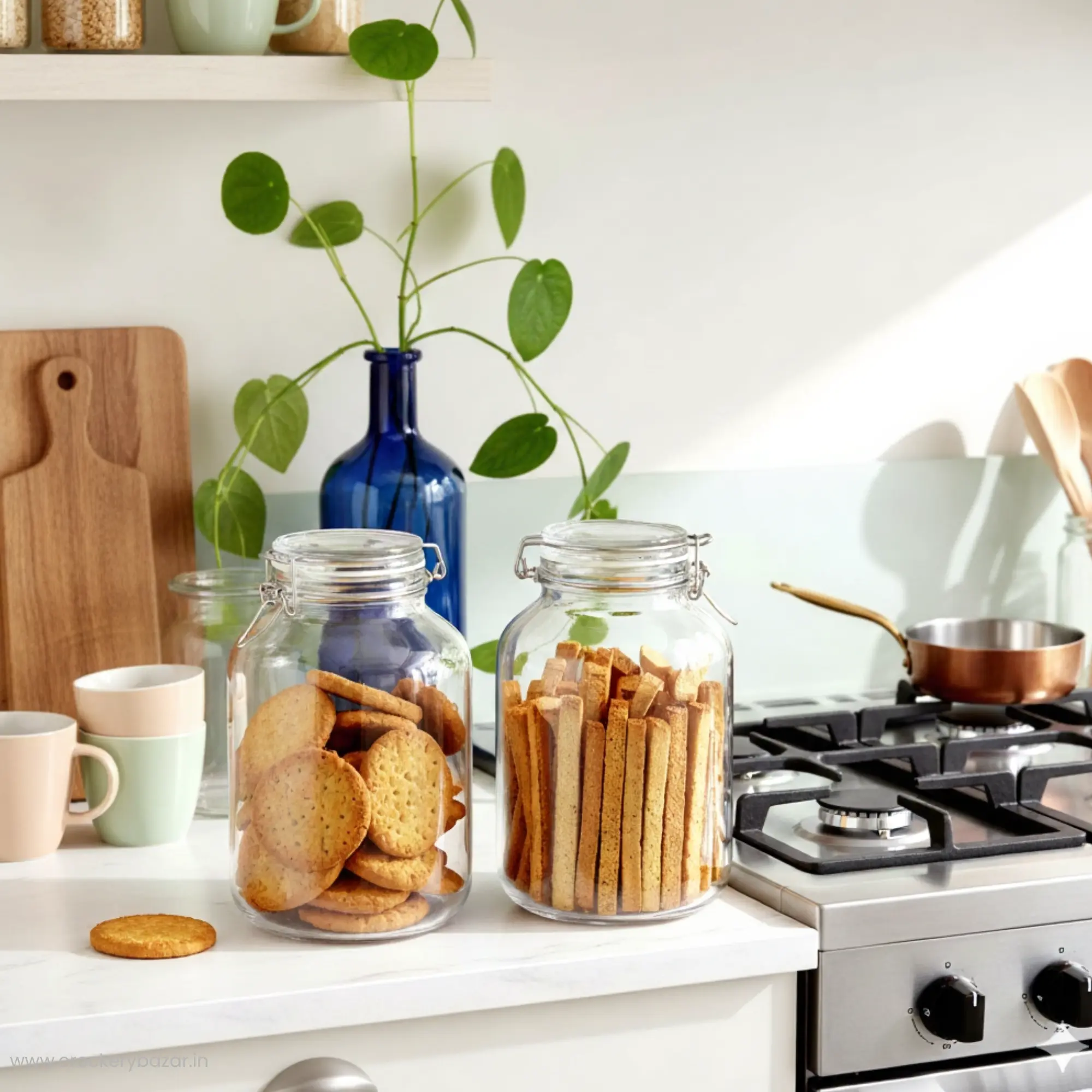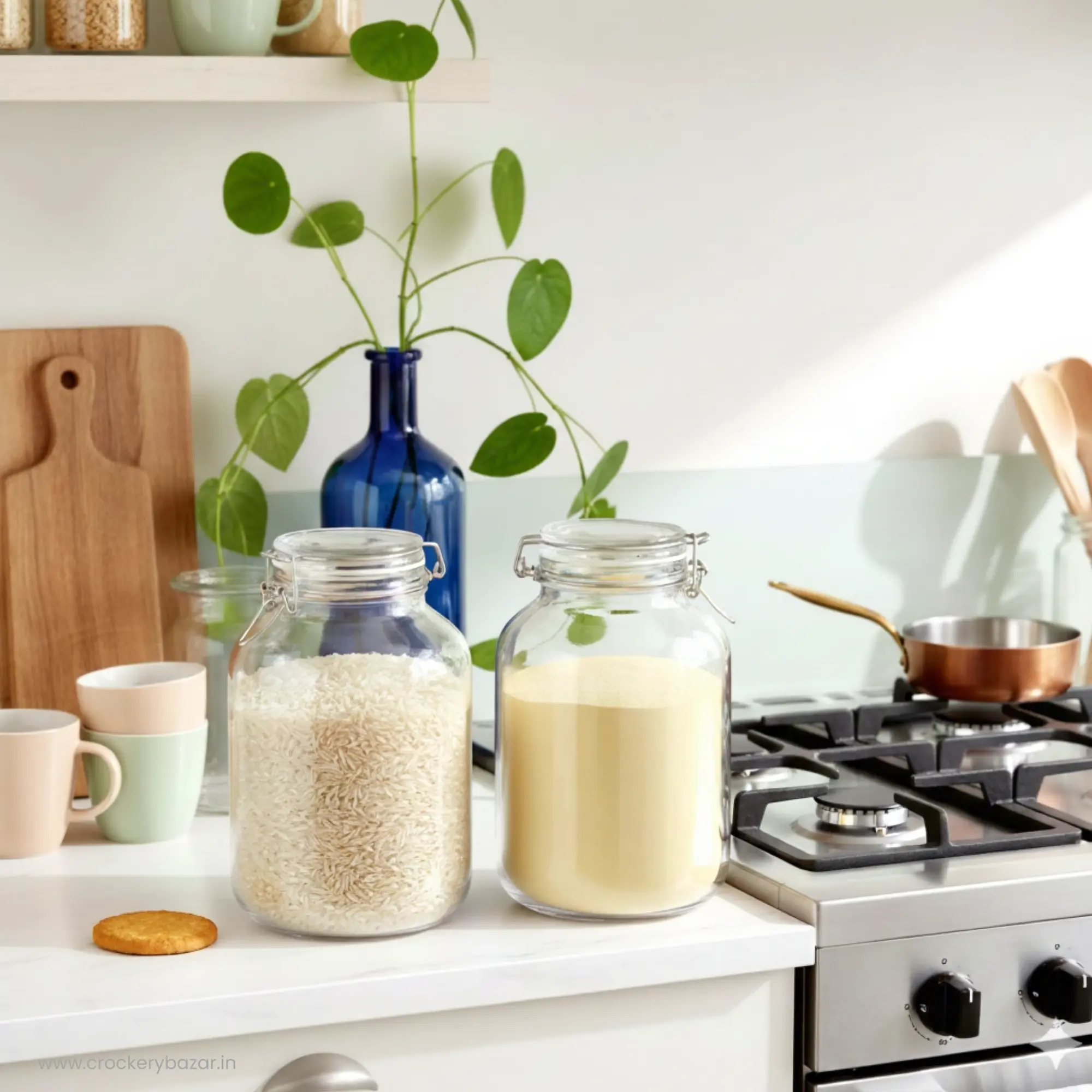 The clear, high-quality glass body lets you instantly see contents while adding a premium look to open kitchen shelves and countertops.