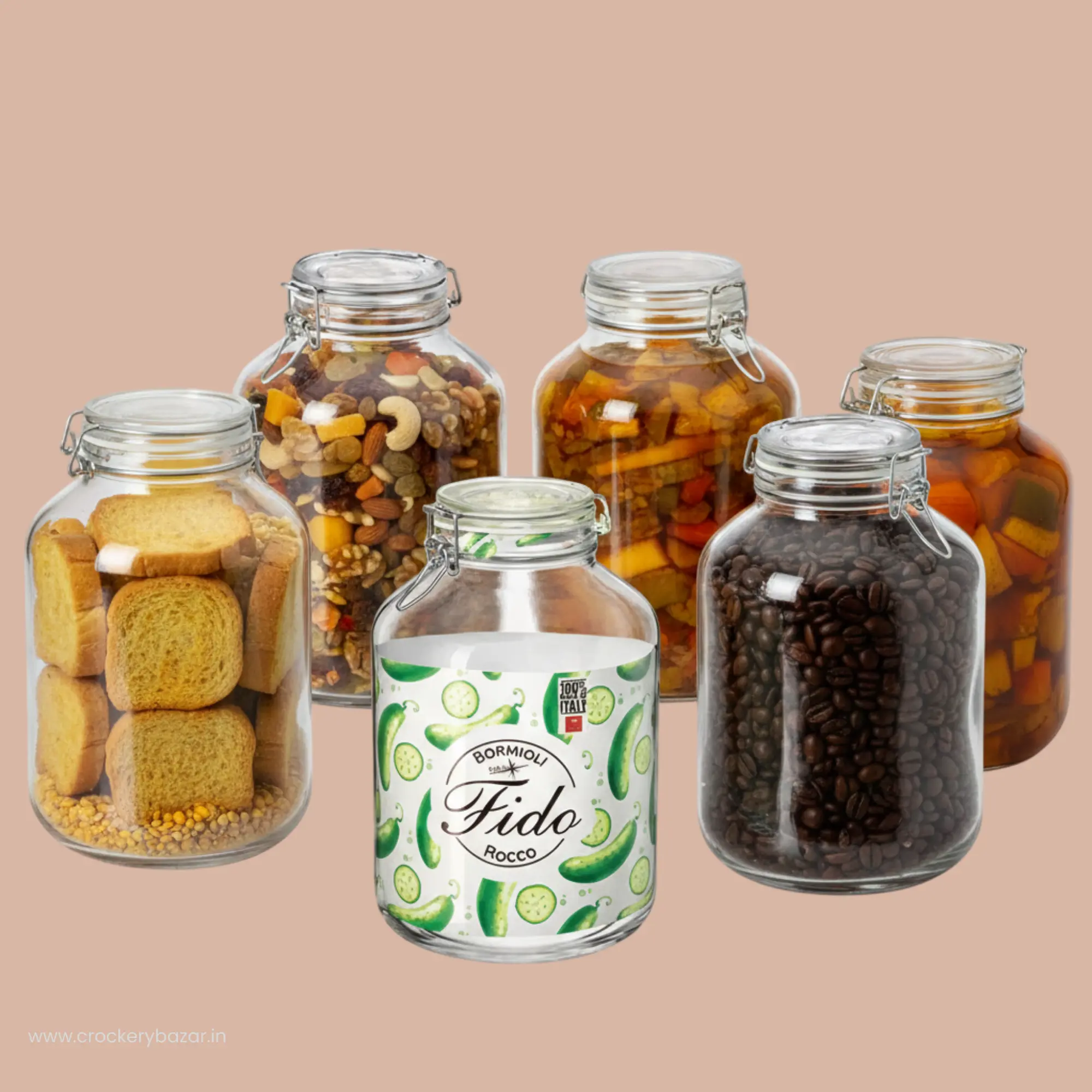 Moisture is the biggest enemy of pantry storage in India. The Fido jar solves this with a zinc-plated metal locking system and a thick, replaceable food-grade rubber gasket that creates a true airtight hermetic seal. Once locked, it blocks air, moisture, and odours—keeping food fresh for longer.