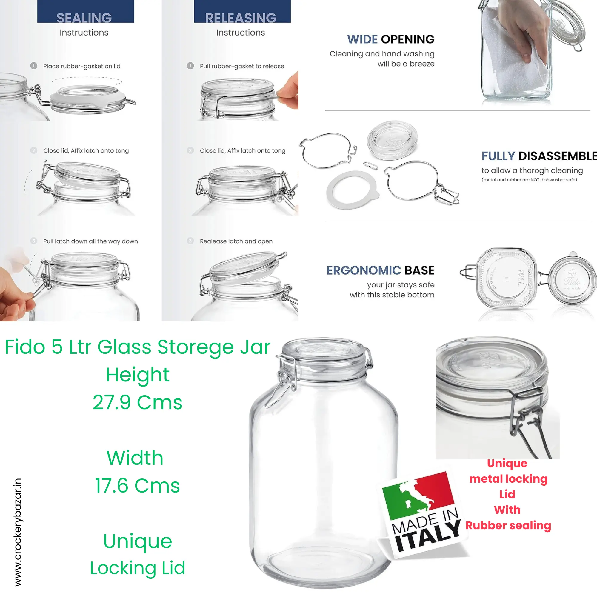 As seen in the product images, the wide opening allows easy filling, scooping, and hand cleaning. The jar can be fully disassembled—glass body, rubber gasket, and metal clamp—for thorough hygiene, making it perfect for Indian cooking and fermentation needs.