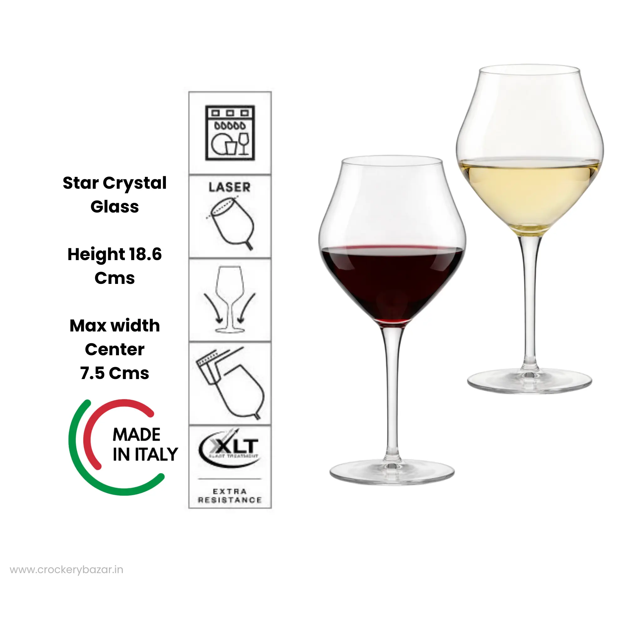 Each stem wine glass is forged from Bormioli Rocco’s exclusive “Star Glass,” a lead-free crystal glass formulation engineered for exceptional purity, brilliance, and a neutral chromatic profile. This ensures that the natural color of both red wine and white wine is presented without distortion, delivering visual clarity usually associated with high-end crystal ware.