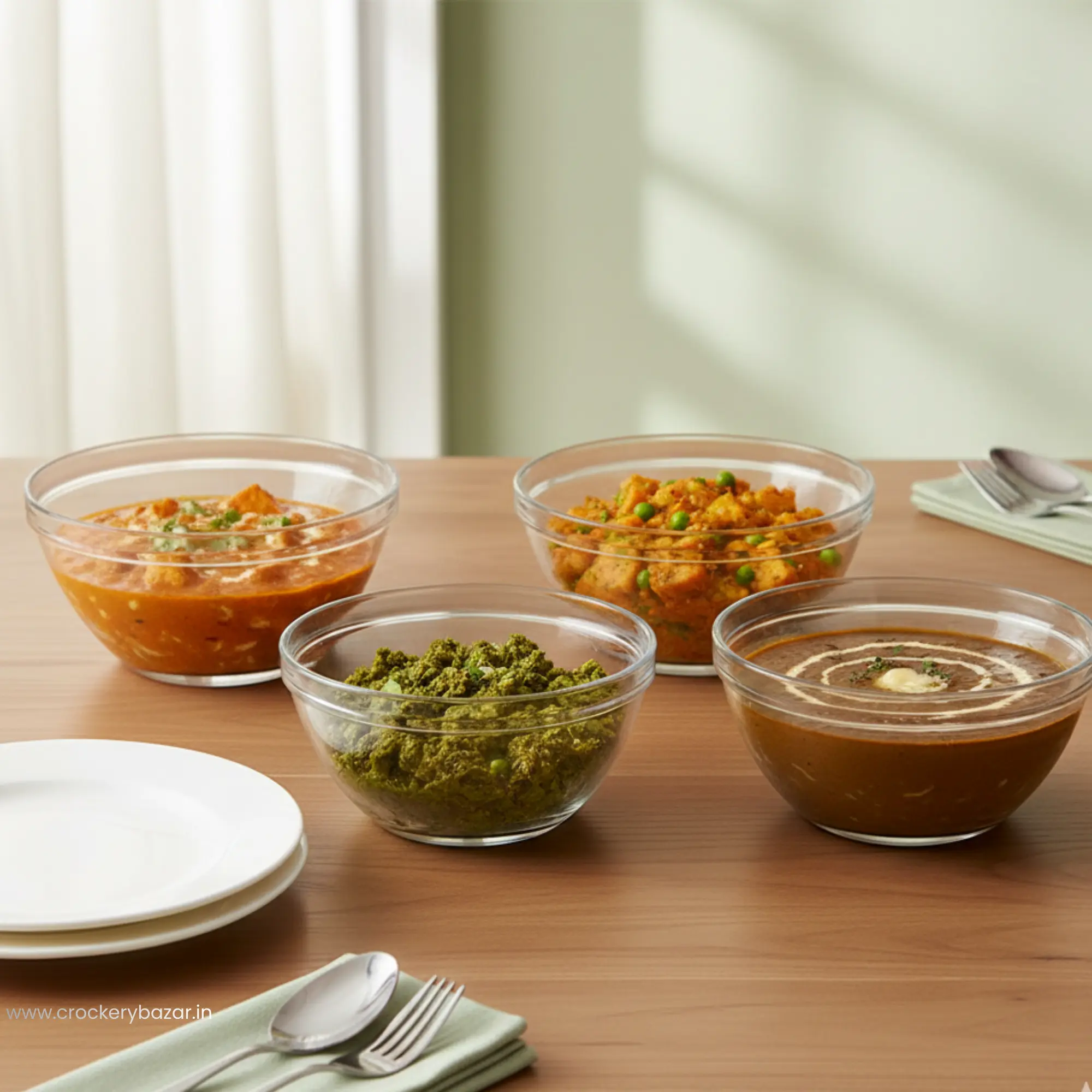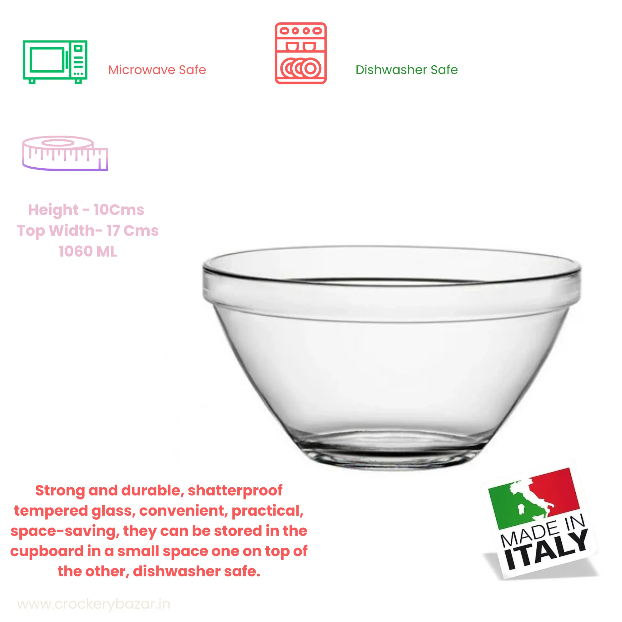Whether you are mixing a refreshing salad, heating a meal in the microwave, or serving a chilled dessert, these versatile bowls handle it all. Their practical, space-saving design allows them to be stacked neatly in a small cupboard, keeping your kitchen organized. Transform your presentation with this robust Italian glassware. Crockery Bazar ensures this set brings both style and durability to your daily dining experience.