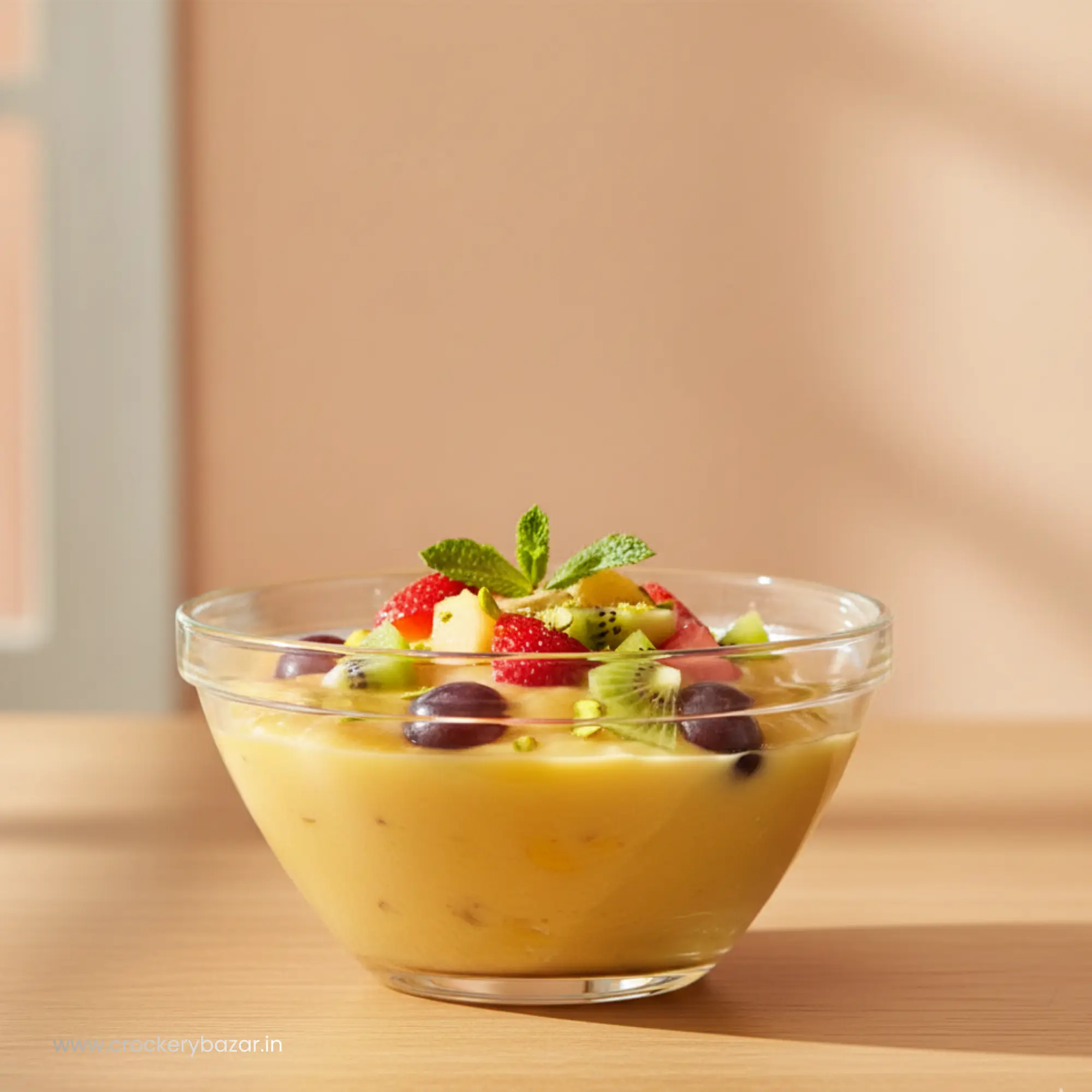 In an exclusive culinary scene set on a wooden dining table, the Bormioli Rocco Pompei glass bowls take center stage. These bowls look magnificent beside aromatic curries, golden desserts, and fresh salads. The transparent, toughened glass showcases the vibrant colors of your food, making every dish appear appetizing and professional.