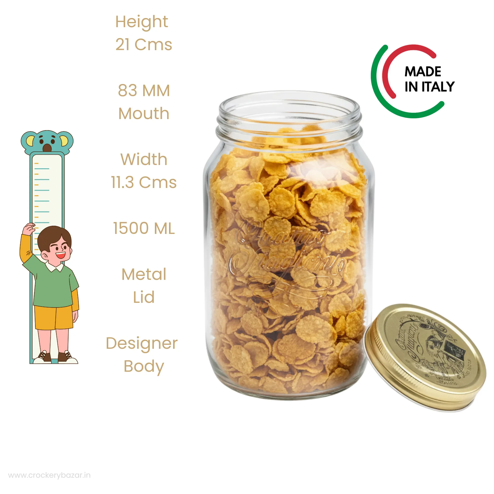 Imported Bormioli Rocco Quattro Stagioni premium 1500ml glass storage jar set (2 pcs) made in Italy. Crafted in food-grade clear glass with an embossed designer body and airtight golden metal lids. Ideal for storing dry fruits, dals, rajma, sugar, snacks, pickles, biscuits and more. Microwave safe without lid. Keep your kitchen organized and your food fresh with this premium set of two 1500 ml glass jars. Featuring a tall, elegant cylindrical shape and a wide 83 mm mouth, these jars combine Italian style with everyday utility. The iconic “Quattro Stagioni” embossed body adds a designer touch to your shelves while making it easy to identify your stored ingredients.